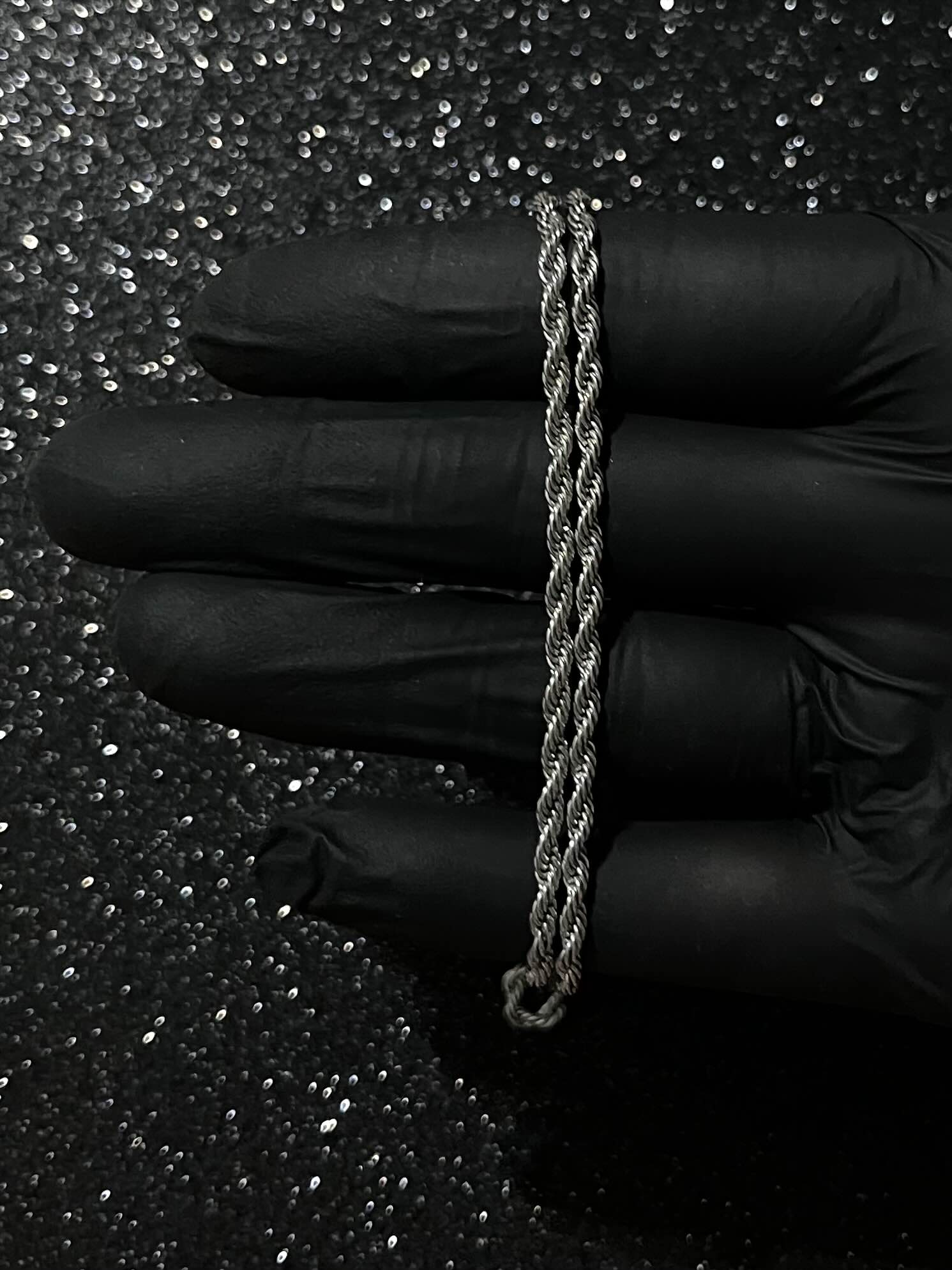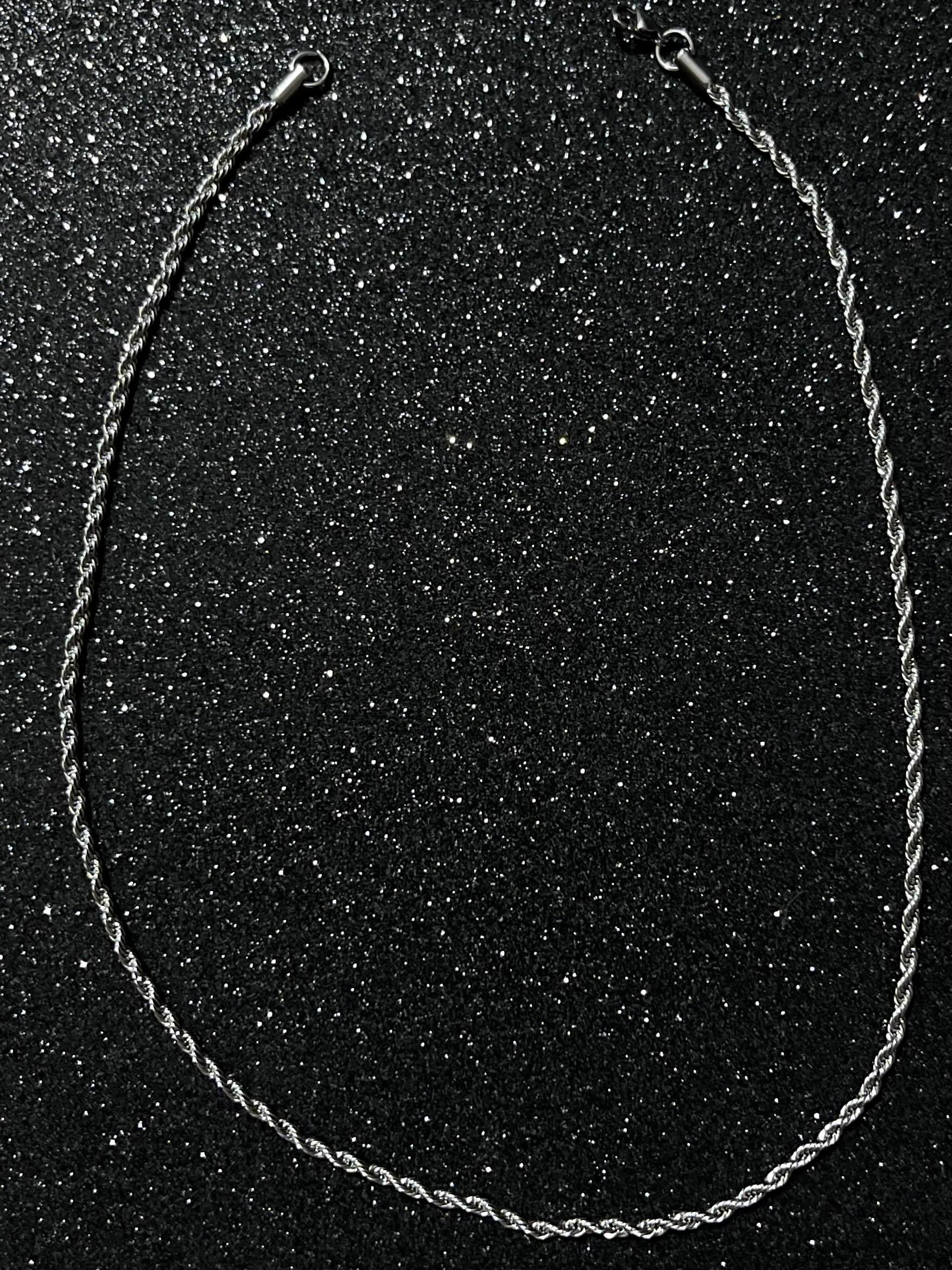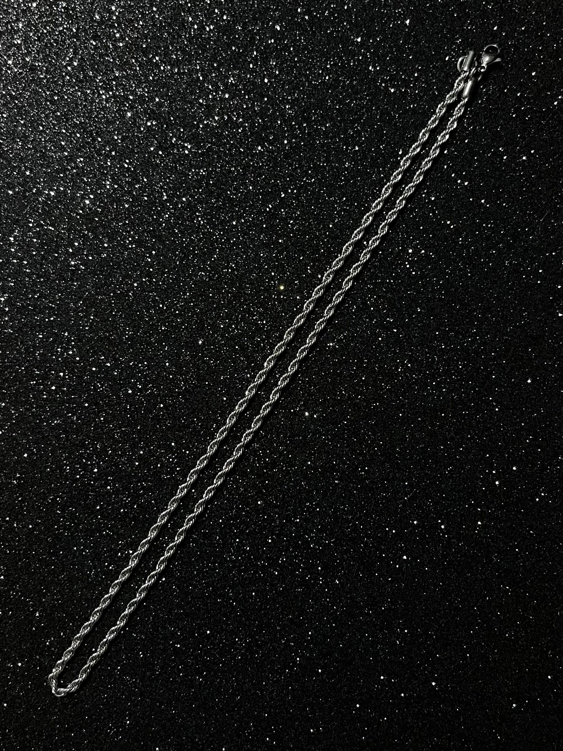 Srebrny Rope Chain w charakterystycznym splocie rope. Łańcuszek ma kolor srebrny, nie jest wykonany ze srebra – dzięki temu zachowuje świetną jakość przy bardzo dobrej cenie i pasuje do każdej stylizacji, zarówno damskiej, jak i męskiej.